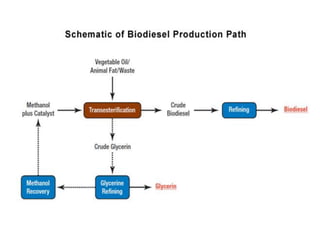 - Biodiesel production involves transesterification of vegetable oils or animal fats with methanol in the presence of a catalyst to produce biodiesel and glycerin.