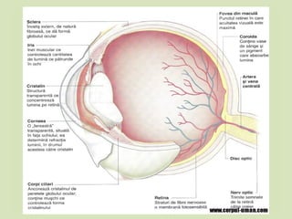Documentul detaliază anatomia ochiului, incluzând tunicile peretelui globului ocular și mediile transparente. Se descriu componentele principale ale ochiului, cum ar fi sclerotica, coroida, retina, cristalinul și organele anexe. De asemenea, sunt prezentate funcțiile fiecărei structuri, precum rolul de protecție, nutriție și percepția vizuală.