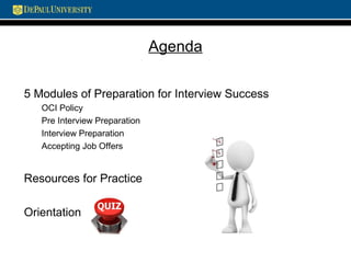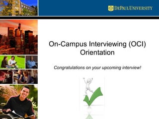 This document provides an overview of DePaul University's On-Campus Interviewing (OCI) program. It covers the following key points: