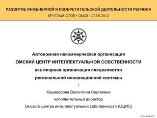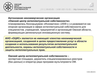 Документ описывает деятельность автономной некоммерческой организации 'Омский центр интеллектуальной собственности', которая служит опорной организацией в сфере интеллектуальной собственности для специалистов и учреждений Омской области. Основные направления деятельности включают юридическую защиту интеллектуальных прав, помощь в оформлении правоустанавливающих документов и организацию образовательных программ по инновациям. Центр также участвует в реализациях целевых программ, направленных на создание и развитие инновационной инфраструктуры региона.