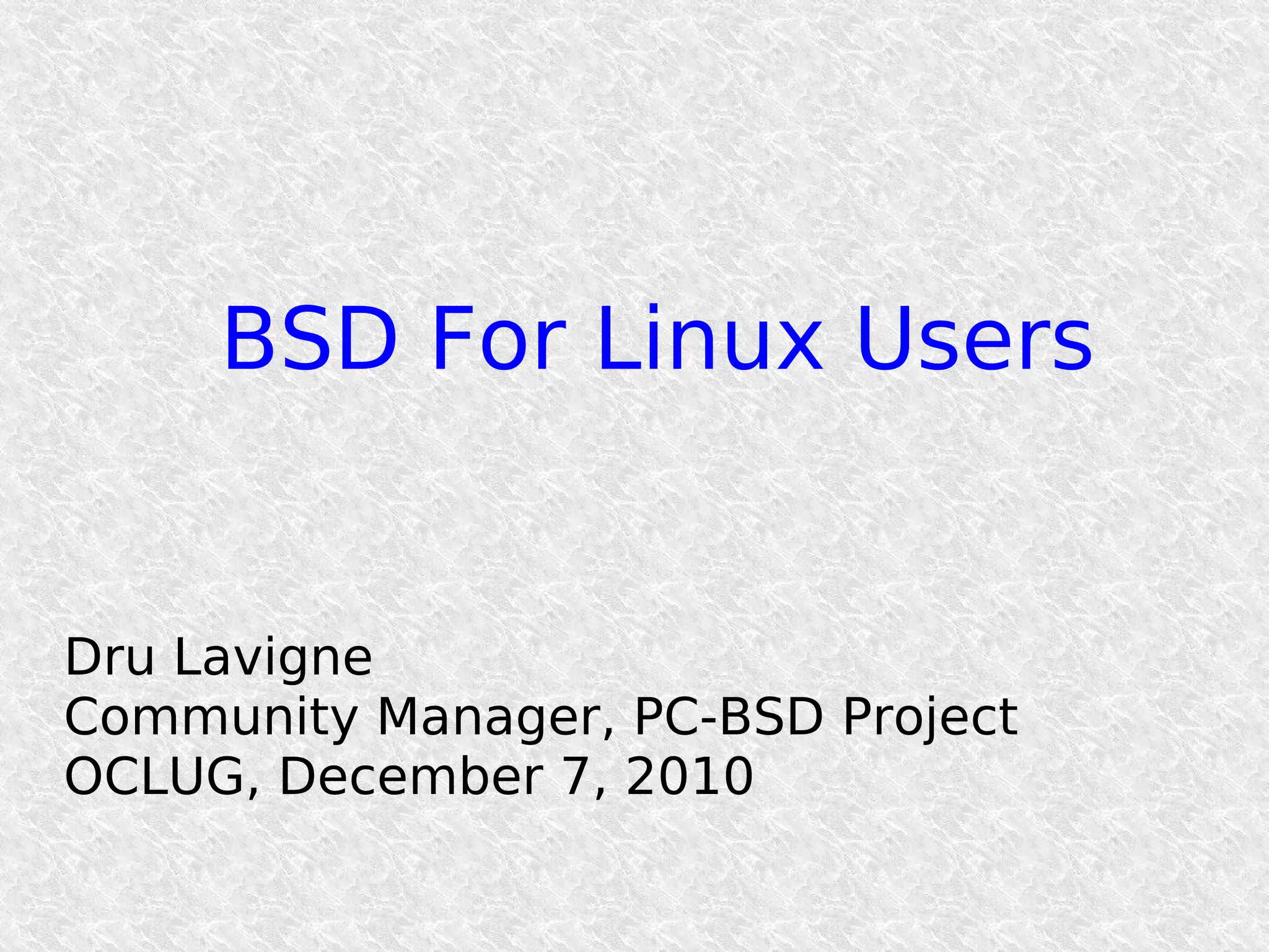 This document summarizes the key differences between BSD and Linux operating systems. It explains that BSD began as patches to Unix from UC Berkeley and later forked into multiple projects with different focuses, like FreeBSD for stability and NetBSD for portability. It outlines differences in features like device naming, startup processes, and configuration files compared to Linux. The document also discusses advantages of BSD's integrated release engineering model and highlights unique BSD features like jails, packages, and security tools.
