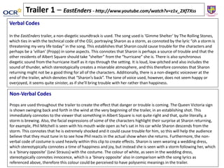 The document provides a textual analysis of two soap opera trailers - one for EastEnders and one for Hollyoaks. For each trailer, the analysis examines the verbal codes (dialogue, music), non-verbal codes (costumes, facial expressions, settings), and technical codes (camerawork, editing). Key strengths highlighted for the EastEnders trailer include its use of relevant non-diegetic music and the symbolic meaning conveyed through Sharon's wedding dress costume. For the Hollyoaks trailer, strengths called out are its use of a diegetic sound bed that hints at a secret from the characters, relevant diegetic dialogue, and ominous text at the beginning. The document discusses elements from each trailer that the author would like