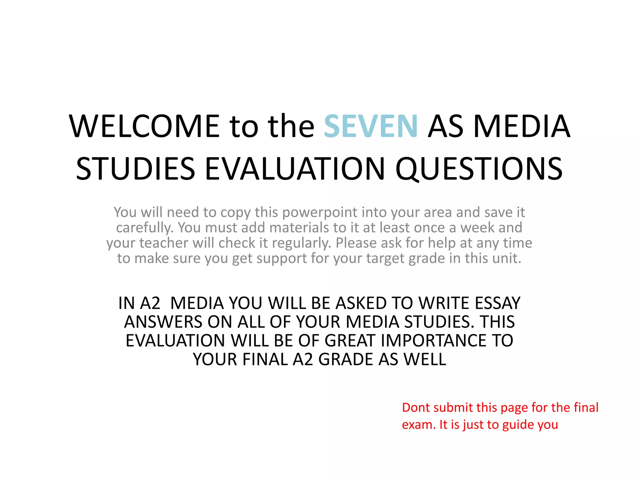 This document provides guidance for a media studies evaluation assignment. Students are instructed to copy the PowerPoint into their area and add materials weekly. The evaluation consists of 7 questions relating to the student's media product and process. Students should demonstrate their digital media skills through visual and engaging responses. They are asked to submit at least 5 slides per question, which can include links, charts and embedded media. The document models how responses should be formatted and provides examples of the types of questions that will be asked, including about audience, representation, technologies used, conventions, distribution and lessons learned.