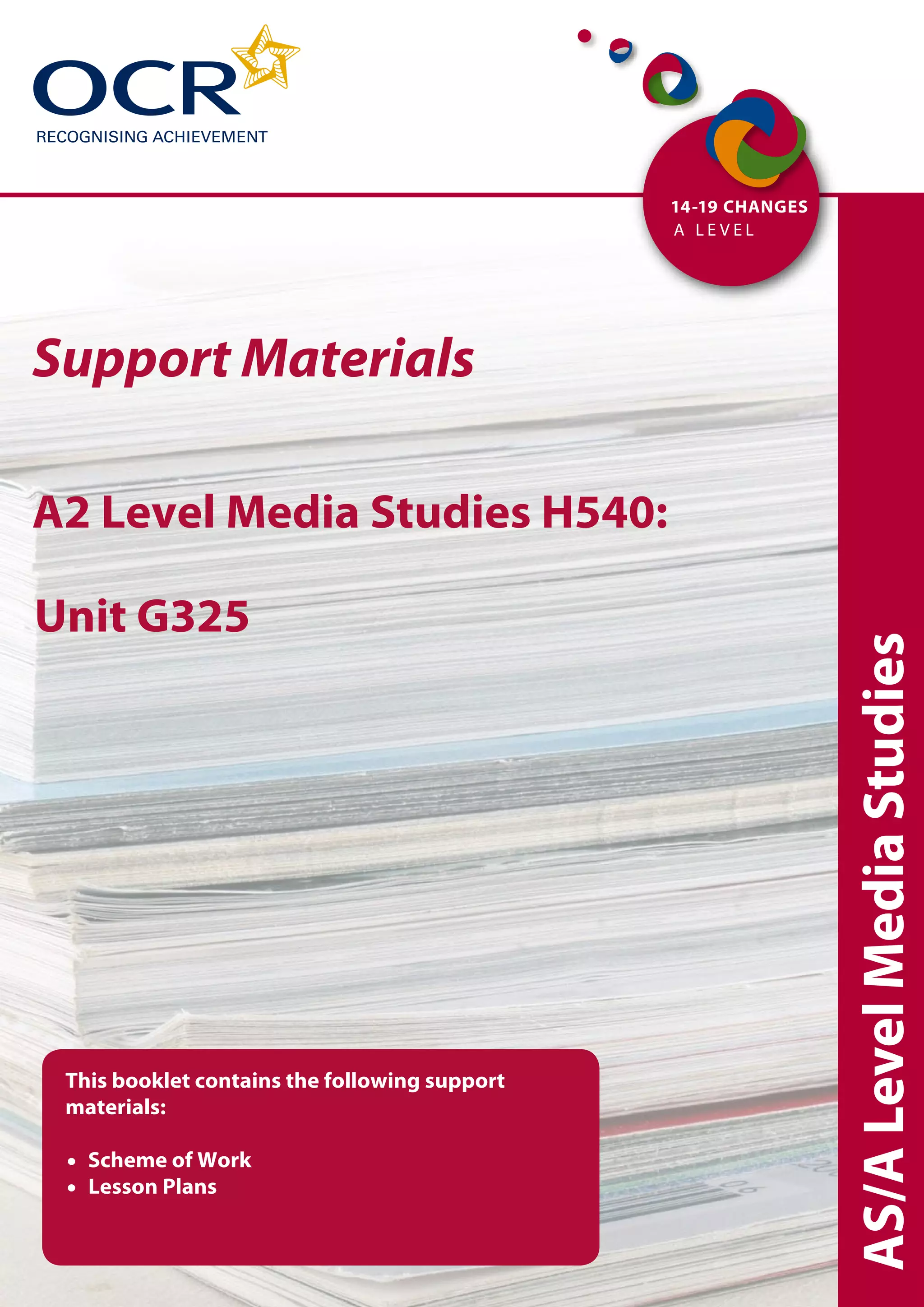 The document provides support materials for teaching Media Studies H540: Critical Perspectives in Media: G325 at A2 level. It includes a suggested scheme of work covering 45 hours with topics on contemporary media regulation. Lesson plans provide teaching activities, suggested resources, and points to note for each topic. Activities include brainstorming press freedom, evaluating case studies of media misrepresentation, researching self-regulation through the Press Complaints Commission, and a reading exercise on regulation and control with a case study on Elton John vs. The Sun newspaper. Students present on the role of the PCC and complete a reading activity on the history of press standards for homework.