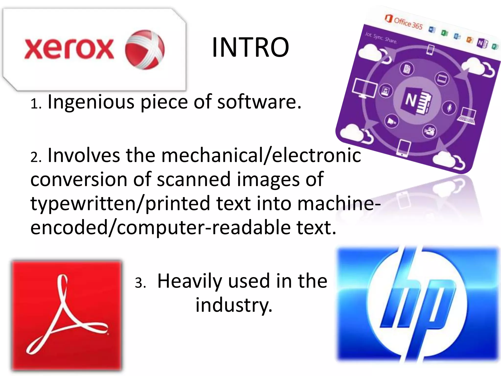 Optical Character Recognition (OCR) involves the conversion of scanned images of printed text into machine-readable text. It is heavily used in industry for applications like editing, scanning, searching, and compact storage. The document discusses developing an OCR system using machine learning, artificial intelligence, and neural networks to recognize characters despite variations in image quality, orientation, and language. It outlines the technologies, current progress implementing linear and logistic regression models, and future plans for character segmentation and feature extraction.