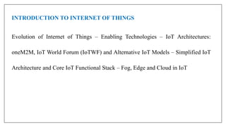 The document provides a comprehensive overview of the Internet of Things (IoT), detailing its definition, evolution, enabling technologies, lifecycle, and applications. It highlights key components such as IoT hardware, software, communication protocols, and standard architectures like oneM2M and IoT World Forum, emphasizing their roles in device connectivity and data management. Additionally, the document discusses concepts like fog and edge computing, which facilitate data processing close to the source, minimizing latency and enhancing system efficiency.