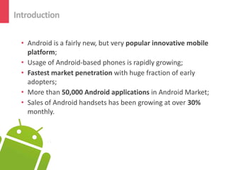 This document provides an overview of Android development. It discusses how Android is a popular and growing mobile platform, with over 50,000 applications available. It outlines the benefits of developing for Android, including an open source environment, customization options, and the ability to deploy across different hardware. The document also describes the experience and capabilities of the development company, including examples of games and indoor positioning applications they have created for Android.