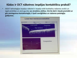 Vai ar OCTpalīdzību var noteikt k/l komplikācijas? Viena no galvenajām funkcijām ir spēja iegūt radzenes attēlus ar k/l invivo. Ar šo metodi var lieliski novērtēt:kontaktlēcu ietekmi uz radzenes morfoloģiju;konstatēt radzenes tūskas kontaktlēcu pacientiem;ir iespējams redzēt rētas, infiltrātus, mucīna bumbas zem kontaktlēcas un depozītus uz kontaktlēcu virsmas;būtisks aspekts ir iespēja novērtēt asaru plēvīti, asaru meniska kvalitāti un kvantitāti.