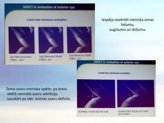 Asaru meniska unkonjunktīvas kroku lielums.Kā OCT attēlā kontaktlēcas izskatās uz radzenes? Piemērots, stāvs, plakansIespēja novērtēt dažādu kontaktlēcu veidu piemērotību dažādām radzenēm gan tās perifērijā, gan centrā, kā tā pieguļ radzenei, cik liela ir atstarpe starp k/l un radzeni.