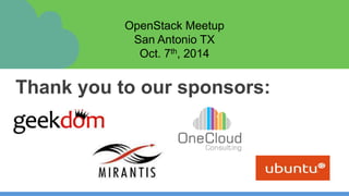The document provides information about an OpenStack Meetup happening on October 7th, 2014 in San Antonio, Texas. It includes details about the event location and organizers, as well as an agenda for introductory OpenStack training modules covering an overview of OpenStack, its architecture, and installing OpenStack.