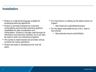 This document provides a comprehensive guide on using Octave for prototyping machine learning applications, including installation instructions and syntax for variable assignments, matrix operations, and basic mathematical functions. It explains how to create matrices and vectors, perform element-wise and matrix multiplication, and generate random values. The document also includes references for further learning and troubleshooting using Gnu tutorials.