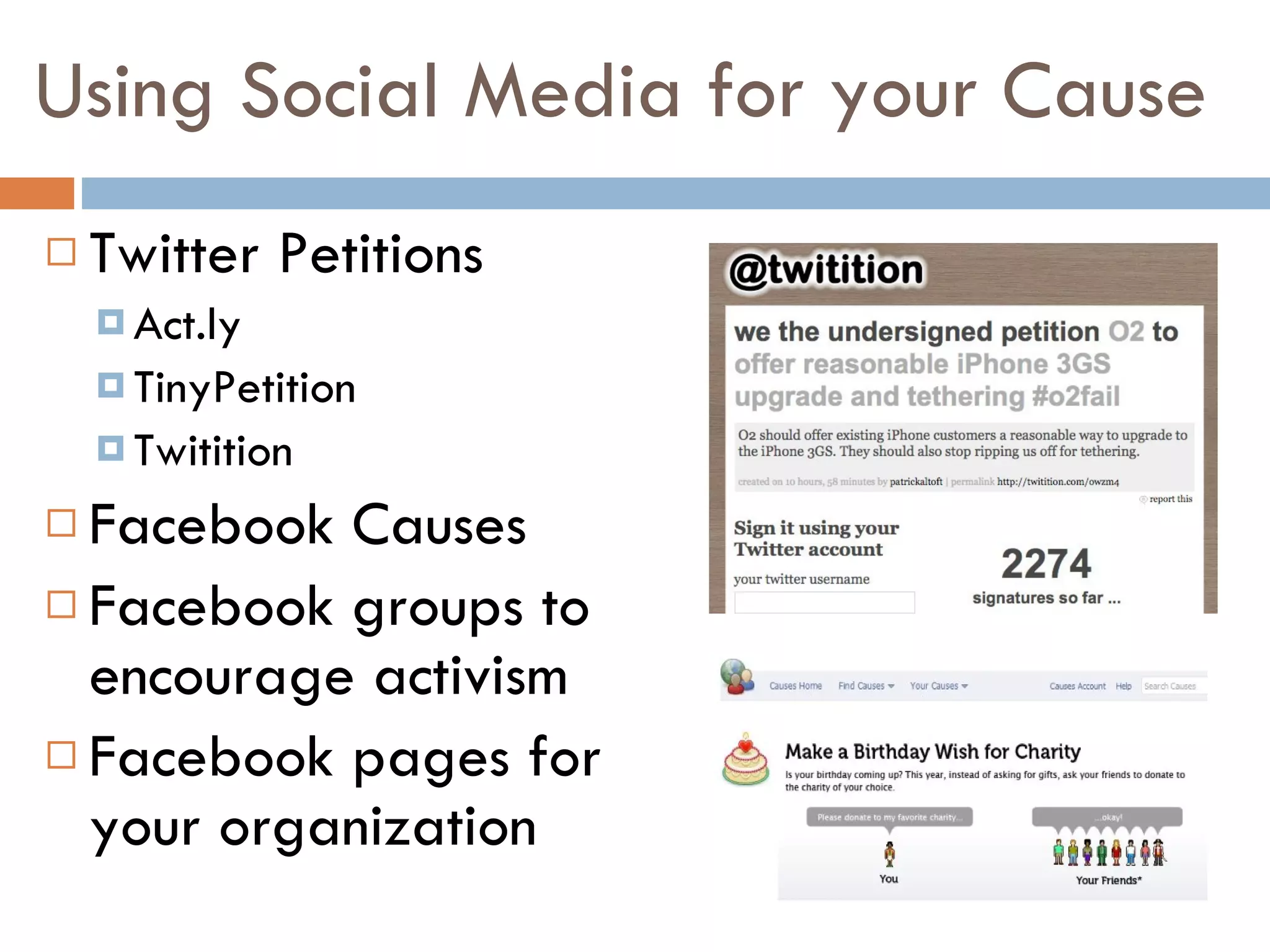 The document provides information on using various social media platforms and websites to support social causes and non-profits. It lists tools for fundraising and advocacy on Twitter, Facebook, and other sites. It also gives recommendations for sites that help non-profits learn how to use social media effectively and connect with volunteers and donors.