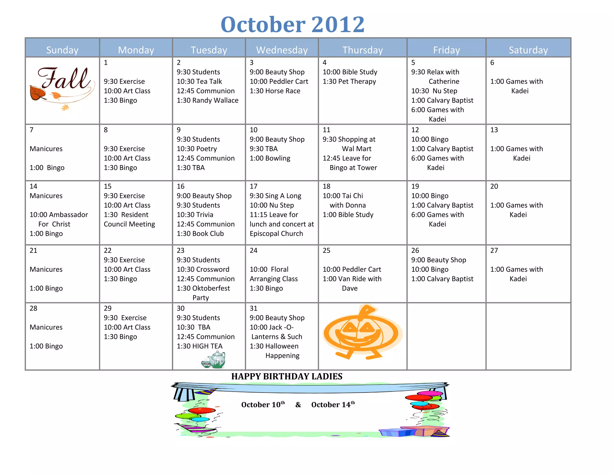 This document contains the weekly schedule for October 2012 at a retirement home. It lists the daily activities for each day of the week, including exercise classes, art classes, religious services, games, shopping trips, and other social activities. Recurring weekly events include students visiting on Tuesdays and Thursdays, beauty shop on Wednesdays, bingo on Mondays and Thursdays, and games with Kadei on Saturdays. It also notes the birthdays of two residents on October 10th and 14th.