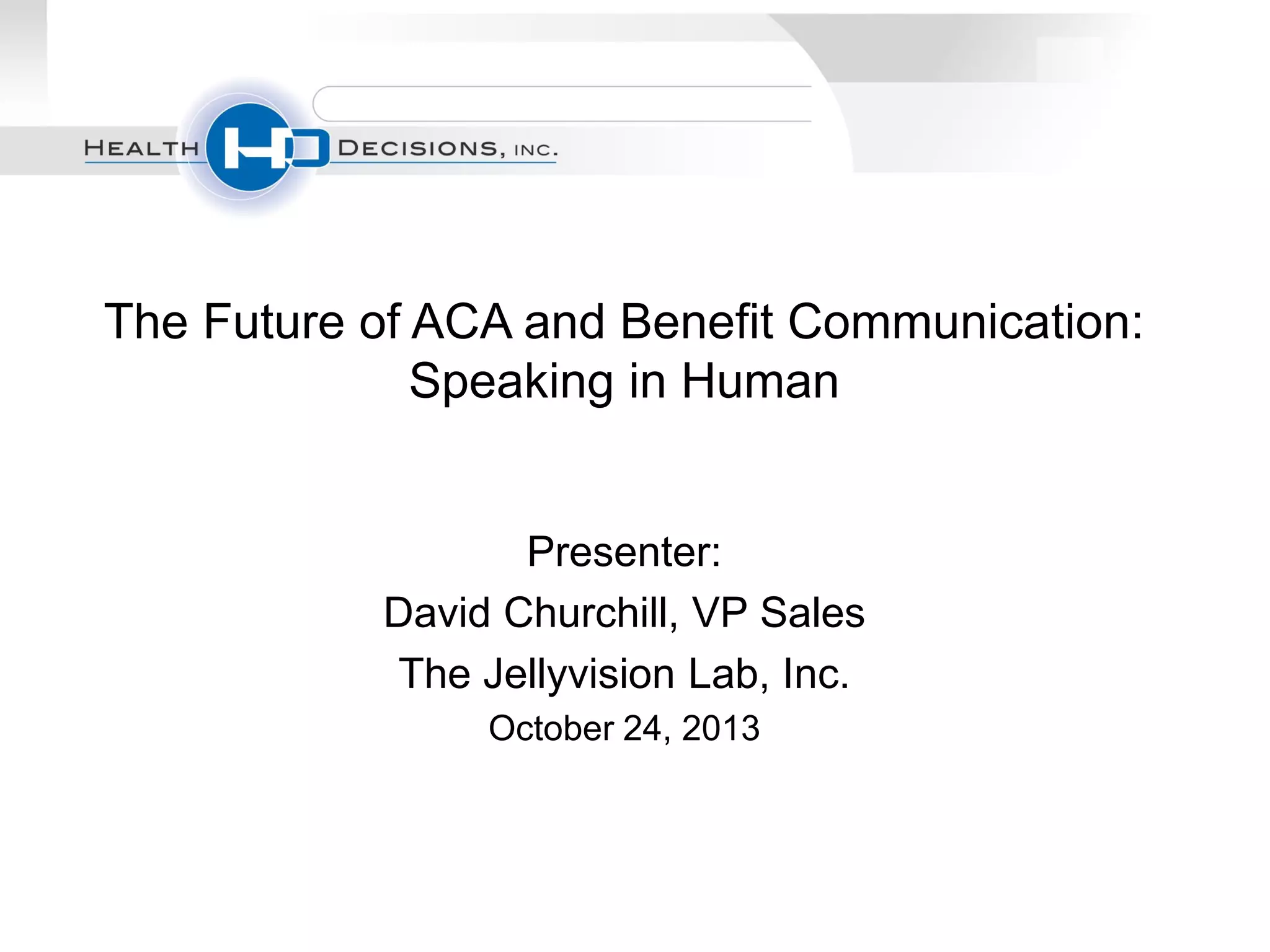 The document highlights a presentation by David Churchill from Jellyvision Lab regarding the future of the Affordable Care Act (ACA) and benefit communication. It mentions their emphasis on customization and solutions in health care post-payment administration and provides a list of past webinars available for request, covering various topics related to health reforms and compliance. For additional information, it directs readers to the Health Decisions website.