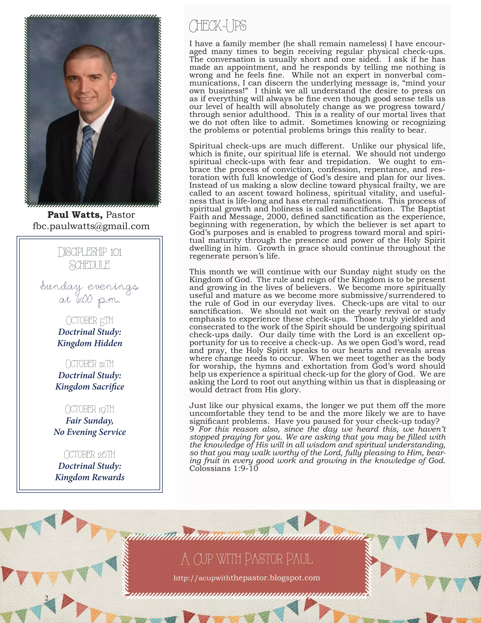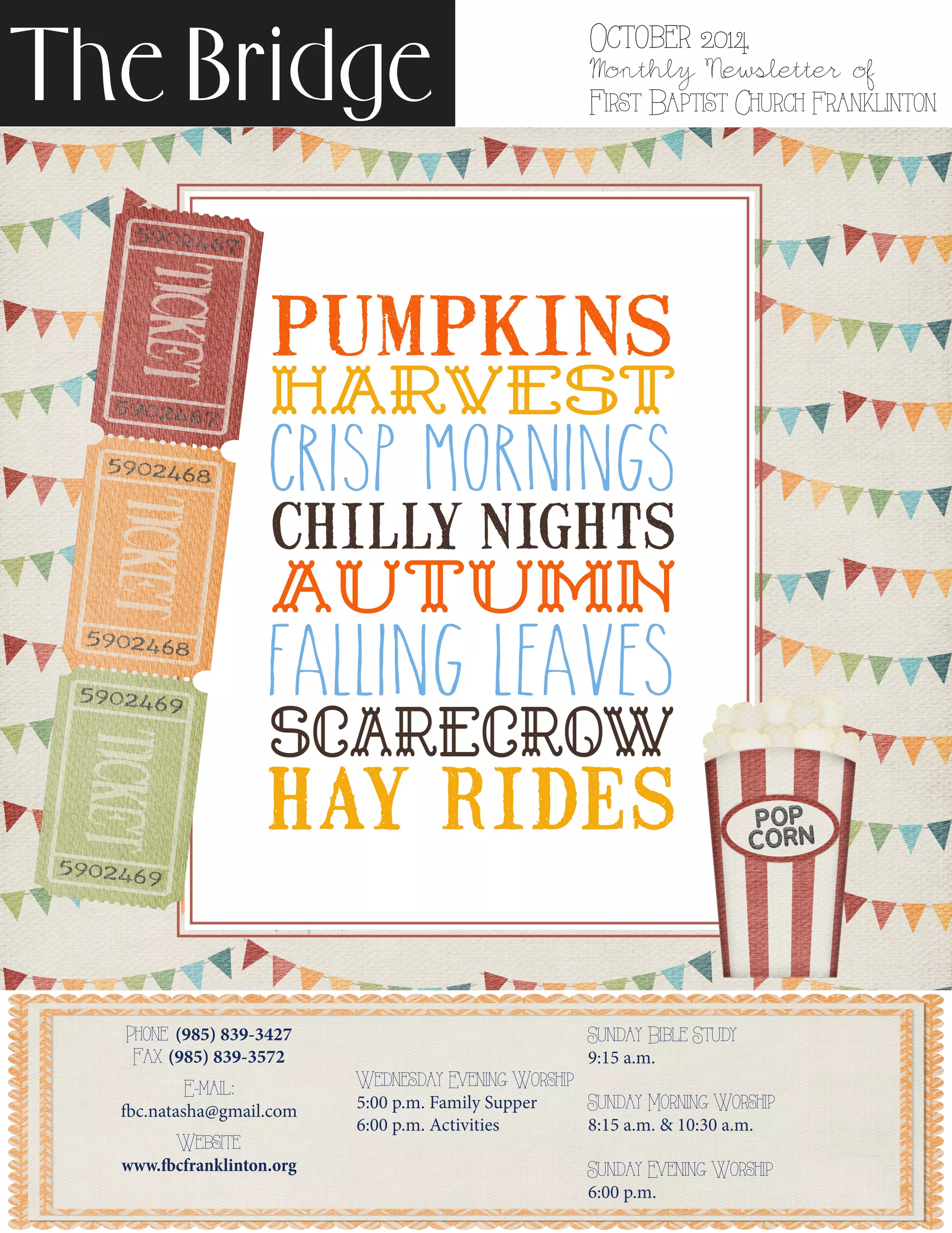 This document is the monthly newsletter of the First Baptist Church of Franklinton. It provides information about the church's services, activities, and leadership. The pastor discusses the importance of regular spiritual check-ups through daily Bible reading and prayer to experience conviction, confession, and growth in holiness. The student pastor encourages the congregation to pray bold prayers, trusting that God can do anything.