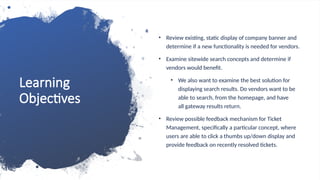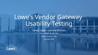 The document outlines a usability testing session for Lowe's Vendor Gateway, focusing on vendor functionality and interaction improvements. Key objectives include evaluating current banner display and site-wide search features, gathering user feedback on these concepts, and exploring ticket management feedback mechanisms. The testing aims to enhance the user experience through collaborative input from vendors on proposed features.