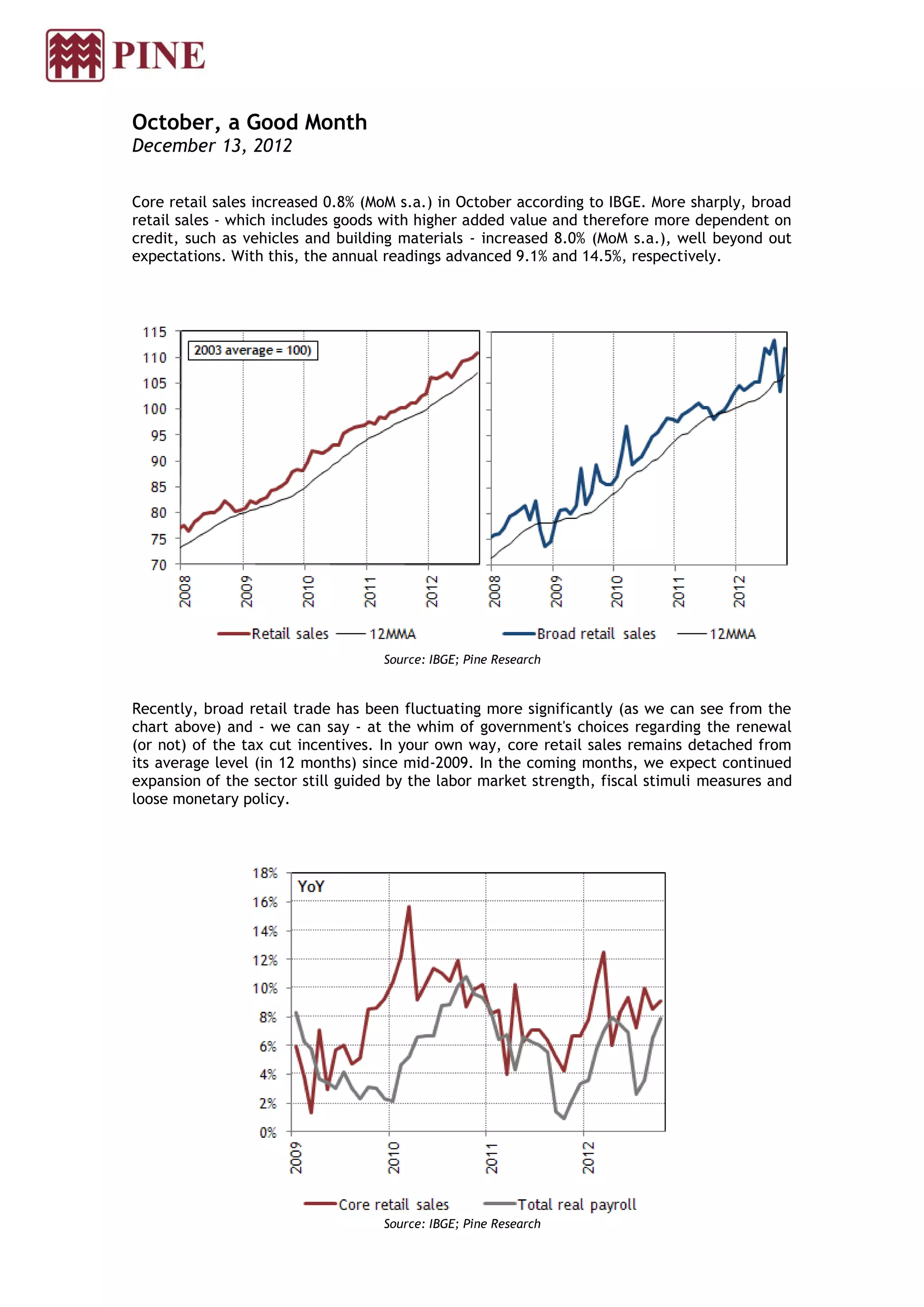 - Core retail sales in Brazil increased 0.8% in October and broad retail sales increased 8.0%, exceeding expectations. Annual growth rates were 9.1% and 14.5% respectively.