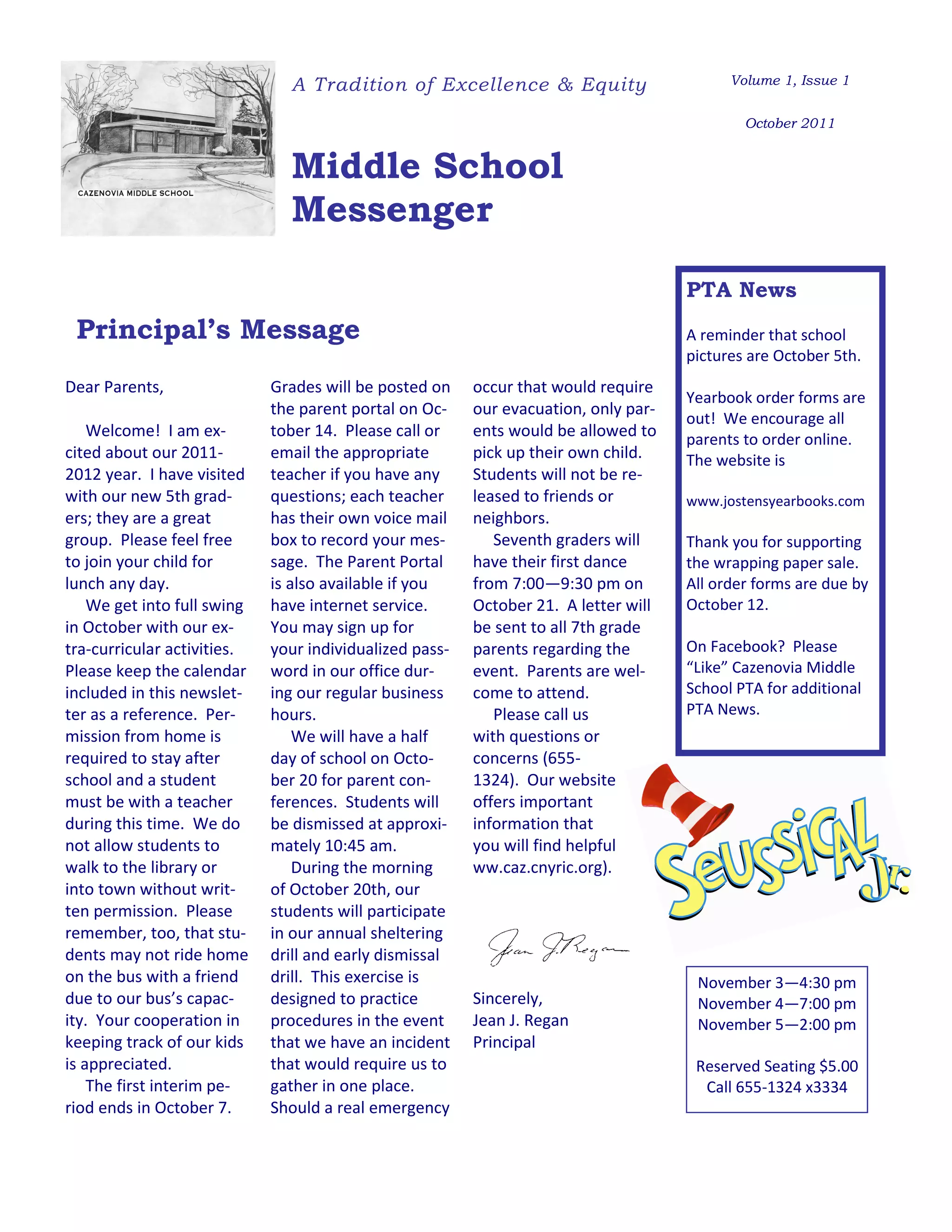 This monthly newsletter from Cazenovia Middle School provides information to parents about upcoming events. It announces that report cards will be posted online on October 14th and that parent-teacher conferences will occur on October 20th, with half-day dismissal. It also advertises that the 7th grade dance will be held on October 21st and that the school play "Seussical" will have performances in early November. The PTA section reminds about school pictures and yearbook ordering deadlines and encourages parents to follow the PTA Facebook page.
