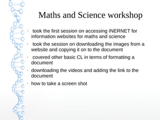 The document outlines a number of workshops and activities conducted in maths, science, and teaching capacity building. It discusses sessions on accessing the internet for educational resources, downloading images and videos, and formatting documents. Workshops also covered introducing Ubuntu, email setup, and reviewing lesson plans and materials. Future plans include cascade workshops, school visits, and continuing to develop online education resources.