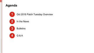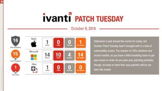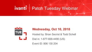 The document details an upcoming Patch Tuesday webinar scheduled for October 10, 2018, hosted by Brian Secrist and Todd Schell, which will cover an overview of the patch updates, recent news including a Google+ shutdown, and significant vulnerabilities in Microsoft products. It highlights key updates and security threats, including known issues related to Windows 10 and various vulnerabilities across different Windows versions, particularly concerning remote code execution and privilege escalation. Additionally, it provides insights on updating processes and security measures necessary for maintaining system integrity.