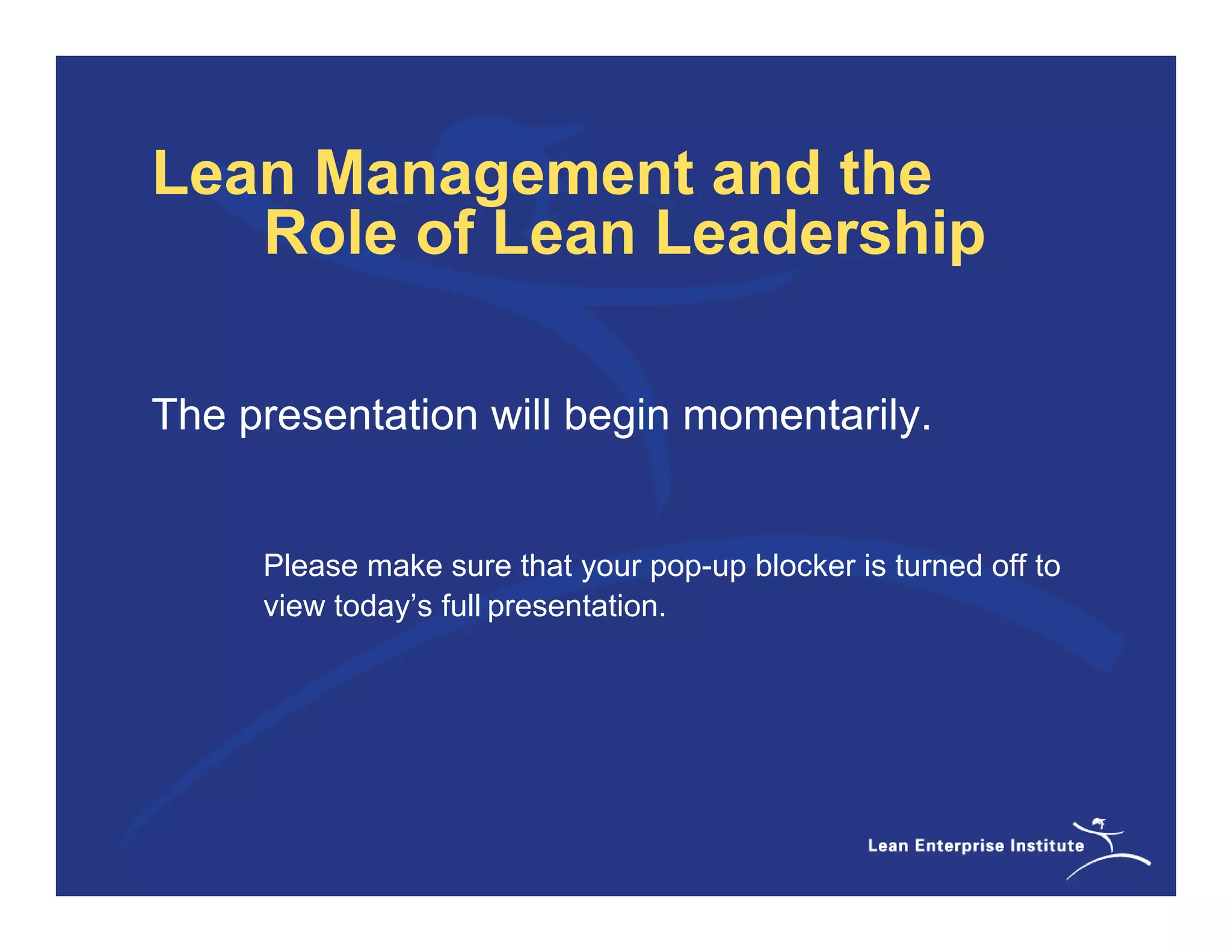 The document discusses lean management and the role of lean leadership. It begins by introducing James Womack and John Shook, who will be presenting. It then discusses some of the key principles of lean management, including focusing on value streams to clearly define purpose and optimize processes. Lean management addresses appointing leaders responsible for each value stream. The presentation then contrasts vertical versus horizontal thinking in organizations and discusses the matrix structure used in some lean organizations. John Shook's portion focuses on what lean leadership entails, such as developing people, aligning jobs to create value, and using tools like standard work and continuous improvement. The presentation emphasizes problem-solving, flexibility, and engaging employees in a way that provides direction while allowing autonomy.