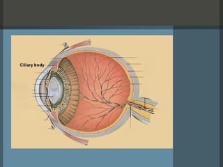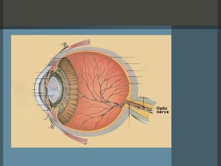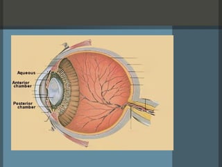The document summarizes the anatomy and structures of the human eye. It describes the eyelid, lacrimal system, cornea, aqueous humor, limbus, conjunctiva, sclera, iris, lens, ciliary body, zonules, vitreous, choroid, retina, intra-ocular muscles, optic nerve, and optic nerve pathways. Key structures include the cornea which refracts light, the iris which controls pupil size, the lens which also refracts light, and the retina which converts light to electrical signals sent to the brain. The optic nerve transmits these signals from the eye to the visual cortex in the brain.
