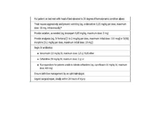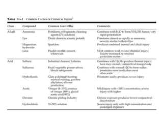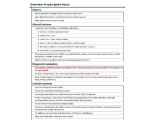 The document discusses various types of ocular injuries including open globe injuries, closed globe injuries, and periocular injuries. Open globe injuries involve a full thickness break of the eye wall, while closed globe injuries do not penetrate the full thickness. Periocular injuries involve structures surrounding the eye such as the eyelids. Specific injuries like corneal abrasions, hyphema, and lid lacerations are described along with their typical presentations, evaluations, and treatments. Ocular trauma requires careful examination and many cases need referral to an ophthalmologist.