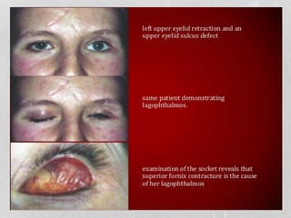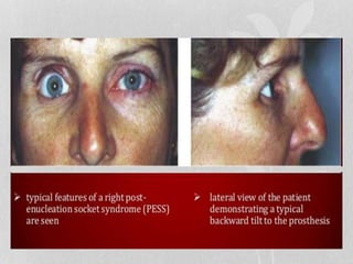 This document discusses ocular prosthetics and management of the anophthalmic socket. It begins by describing the surgical procedures of enucleation, evisceration, and exenteration used to partially or completely remove the eye. It then discusses goals and techniques after these surgeries, including the use of conformers and orbital implants. The document outlines fabrication of ocular prosthetics, including custom made versus ready made, and the impression fitting technique. Common complications are listed along with a study on complications. Ideal management is described to provide comprehensive eye care including prosthesis inspection and specialist referrals.