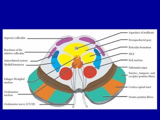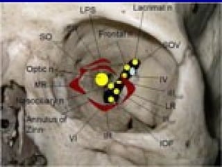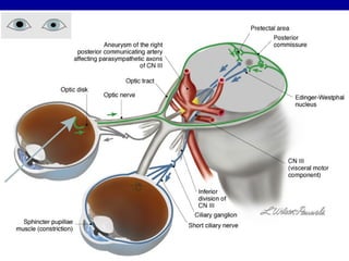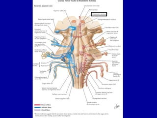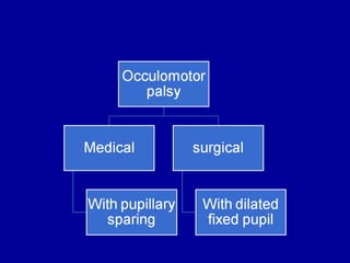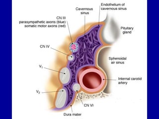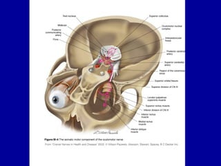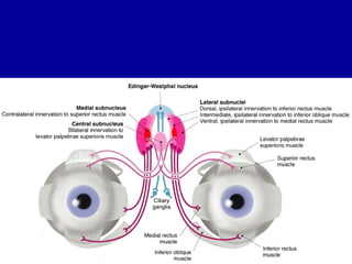 The oculomotor nerve has somatic and visceral motor components. The somatic component supplies four extraocular muscles and the levator palpebrae superioris muscle. The visceral component provides parasympathetic innervation to the constrictor pupillae and ciliary muscles. The oculomotor nerve originates in the midbrain, passes through the cavernous sinus, and enters the orbit through the superior orbital fissure to innervate the extraocular muscles. Damage to the oculomotor nerve can cause an oculomotor nerve palsy and result in drooping of the eyelid and eye muscle weakness.
