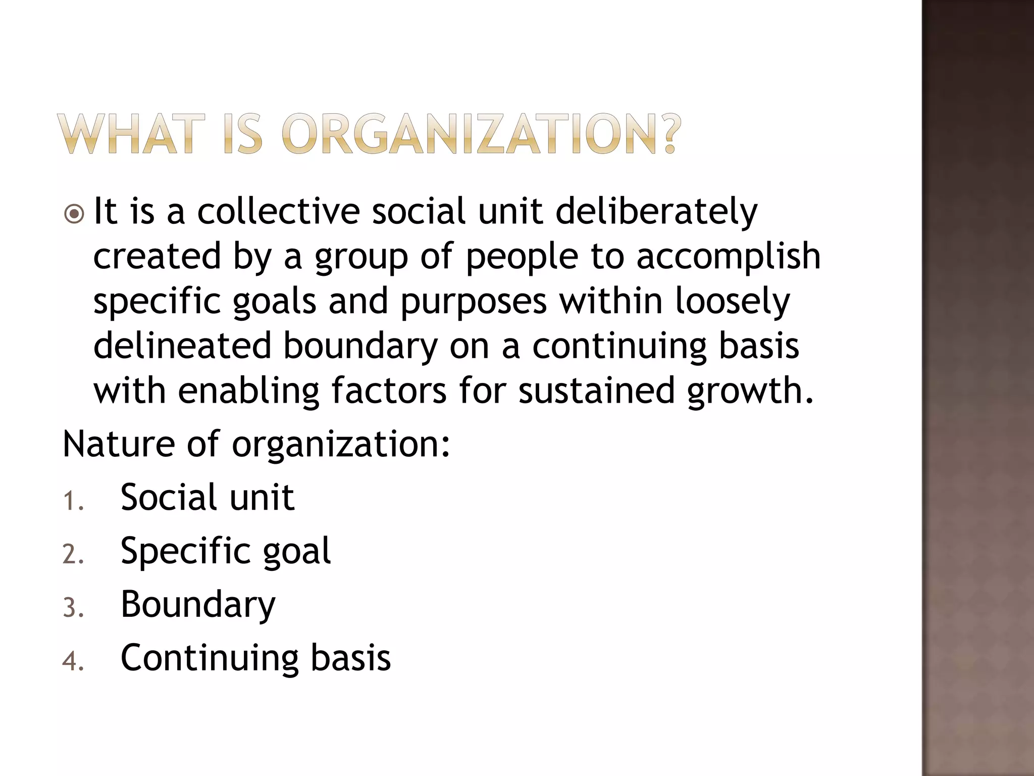 An organization is a social unit deliberately created to achieve specific goals within defined boundaries on an ongoing basis. It can be defined based on its function, purpose, ownership, size, and area. Key components include authority, span of control, chain of command, and hierarchy. Organization charts convey the activities, subdivisions, work, management levels, and lines of authority. Theories of organization include classical, behavioral, management science, systems, and various metaphors like machines, living systems, brains, political systems, and cultures. Effectiveness can be defined using goal attainment, system resource, constituency satisfaction, and internal process approaches.