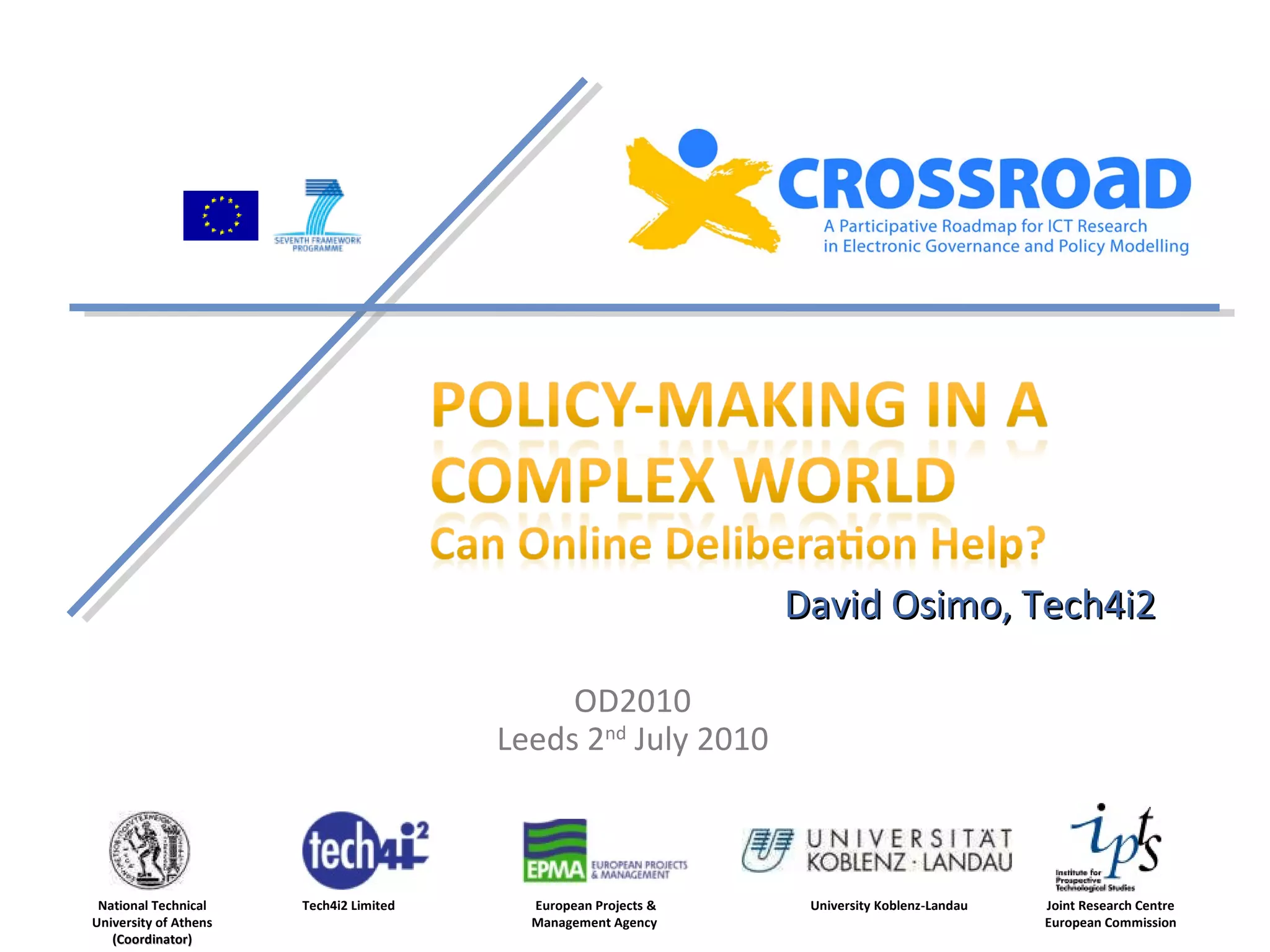 The document discusses research on using ICT tools to improve governance and policy modeling. It proposes: