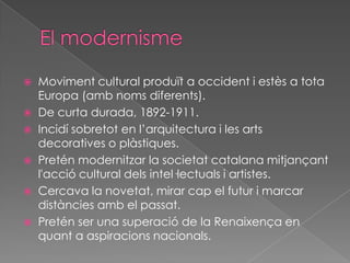 El modernismeMoviment culturalproduït a occident i estès a tota Europa (amb noms diferents). De curta durada, 1892-1911.Incidí sobretot en l’arquitectura i les arts decoratives o plàstiques.Pretén modernitzar la societat catalana mitjançant l'acció cultural dels intel·lectuals i artistes.Cercava la novetat, mirar cap el futur i marcar distàncies amb el passat.Pretén ser una superació de la Renaixença en quant a aspiracions nacionals.
