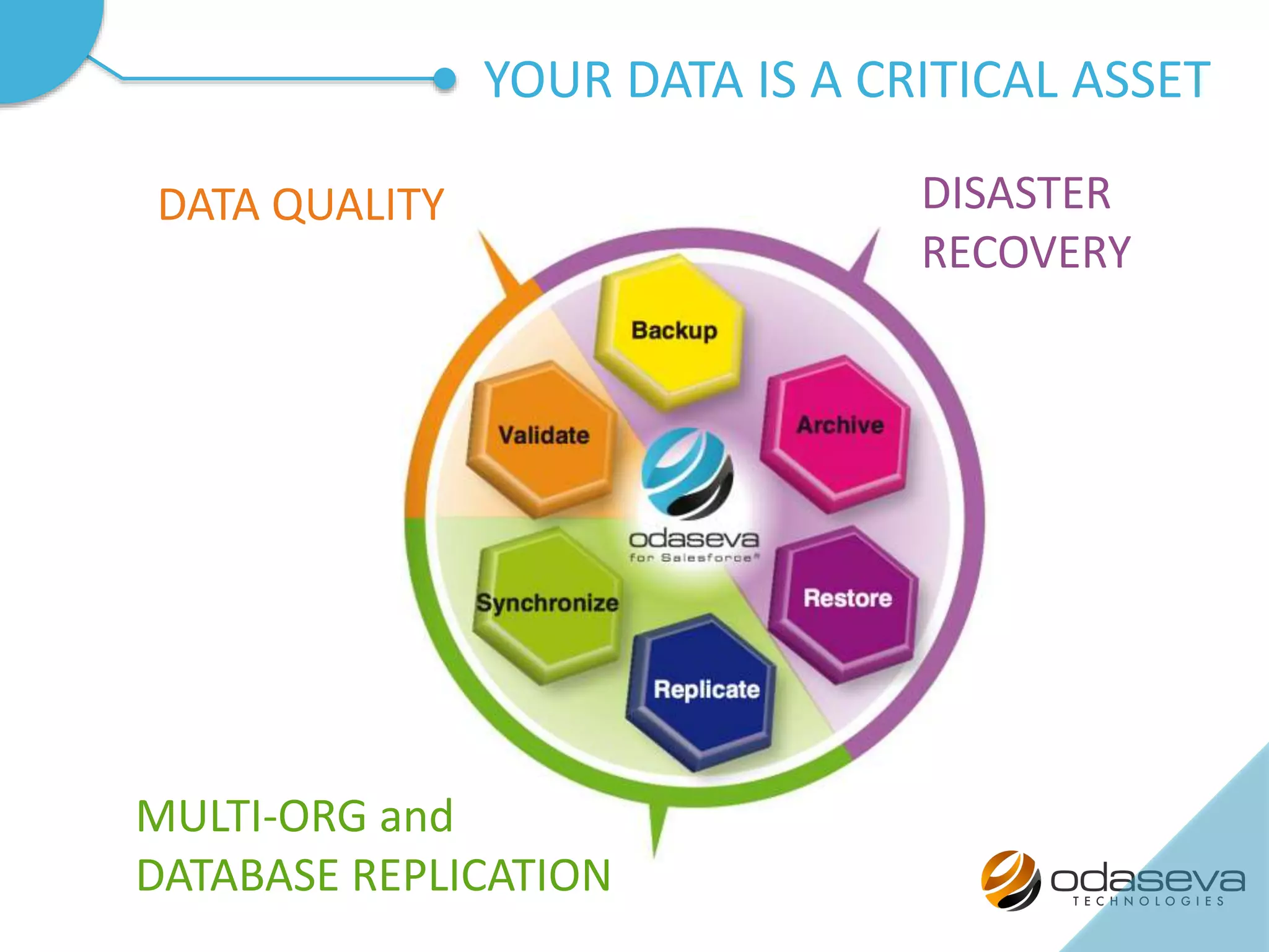 The document outlines Odaseva's enterprise-grade cloud-to-cloud data solutions, emphasizing critical aspects such as data quality, multi-org and database replication, and disaster recovery. Testimonials from satisfied users highlight the effectiveness and user-friendliness of Odaseva's backup solutions, illustrating their importance for businesses like Schneider Electric. Additionally, the document suggests a focus on improving data management processes to mitigate risks associated with data loss.