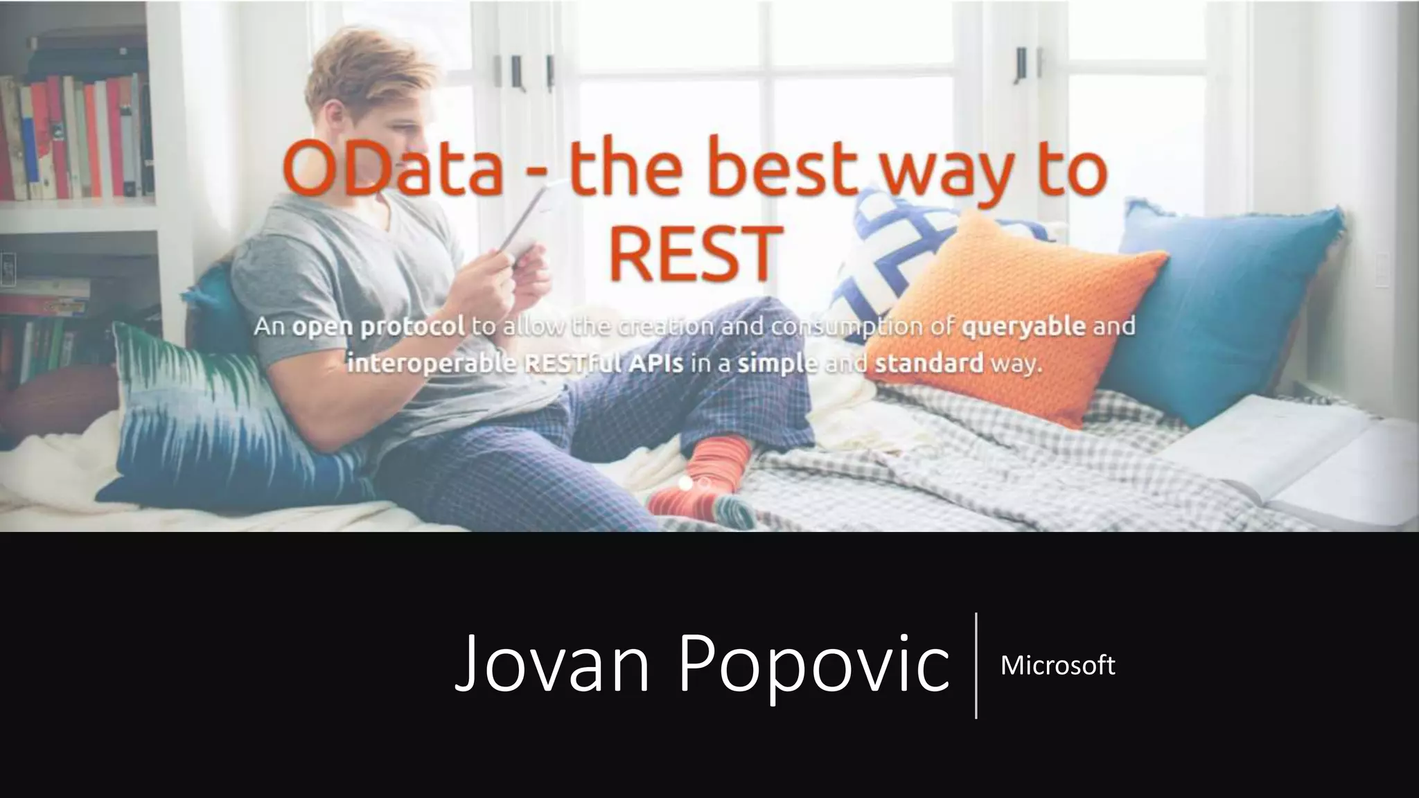 The document explores the use of OData as a standardized protocol for building RESTful APIs, emphasizing its capabilities for handling custom queries and data interactions. It highlights OData's integration with SQL-like querying, offering a variety of methods for retrieving and manipulating data, while also providing details about its version history and contributors. Additionally, it includes practical examples of querying and working with OData services, demonstrating how to implement it using jQuery.