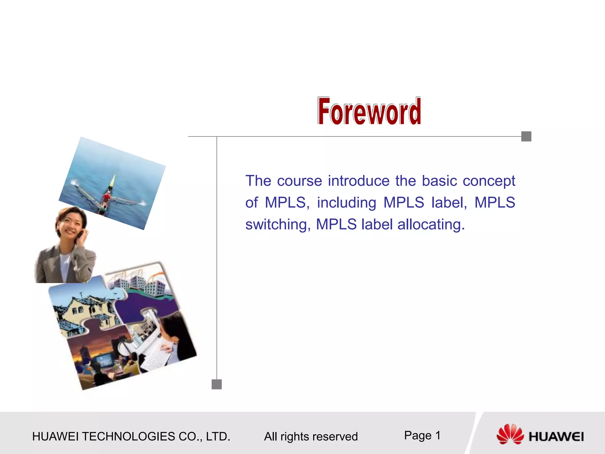 This document provides an overview of MPLS (Multi-Protocol Label Switching) concepts including label switching, label allocation, and label forwarding. It discusses MPLS label structure, label encapsulation, label spaces, label forwarding entries, and label distribution protocols. The key topics covered are: