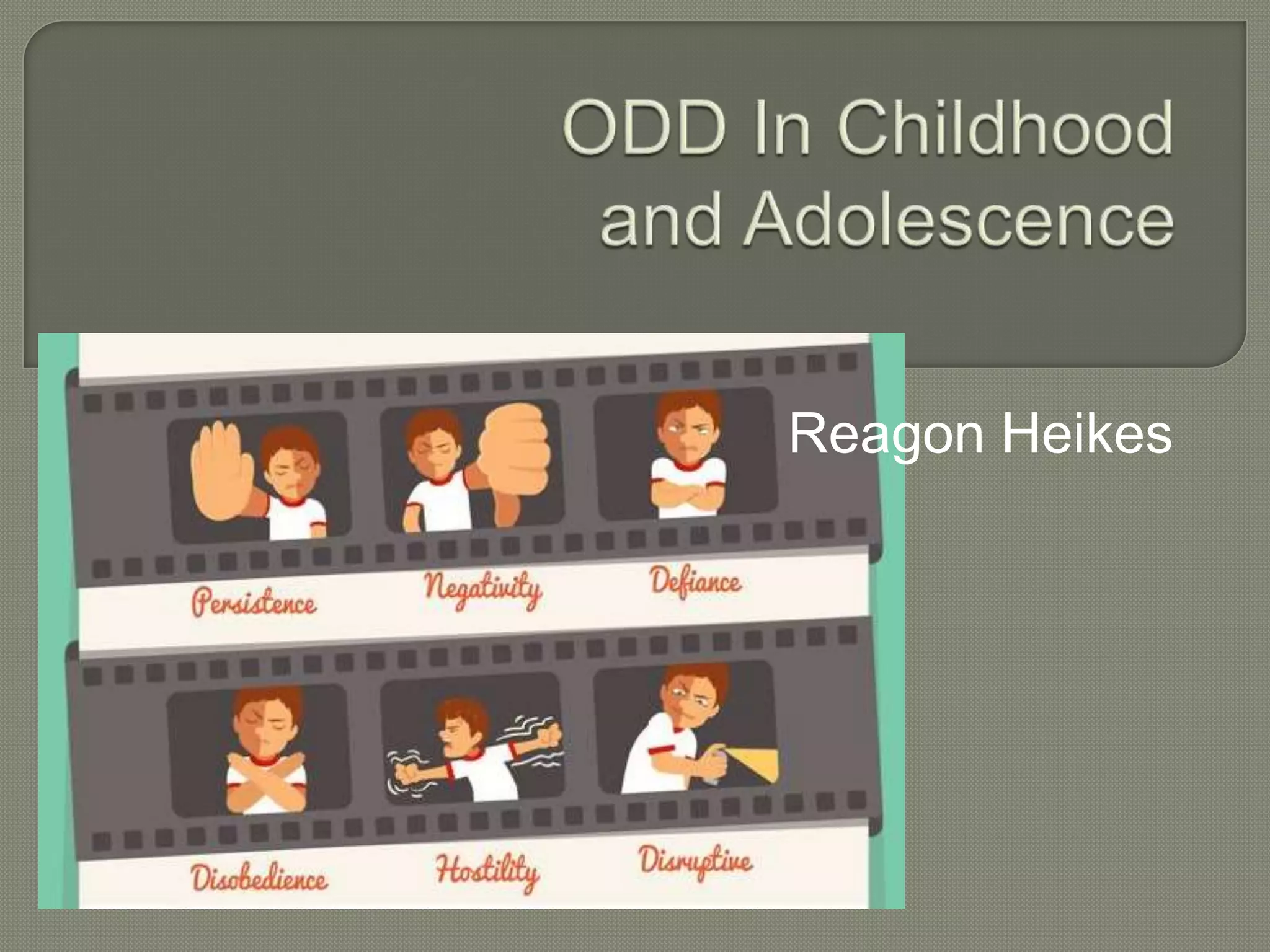 The document summarizes Oppositional Defiant Disorder (ODD), including its diagnostic criteria, prevalence rates, common behaviors, risk factors, treatment approaches, and prognosis. ODD is characterized by angry, irritable mood and argumentative/defiant behavior lasting at least 6 months. Parent-management training to improve positive parenting strategies and reduce negative ones is considered one of the most effective treatment approaches. Approximately two-thirds of children with ODD receiving treatment will be symptom-free after 3 years.