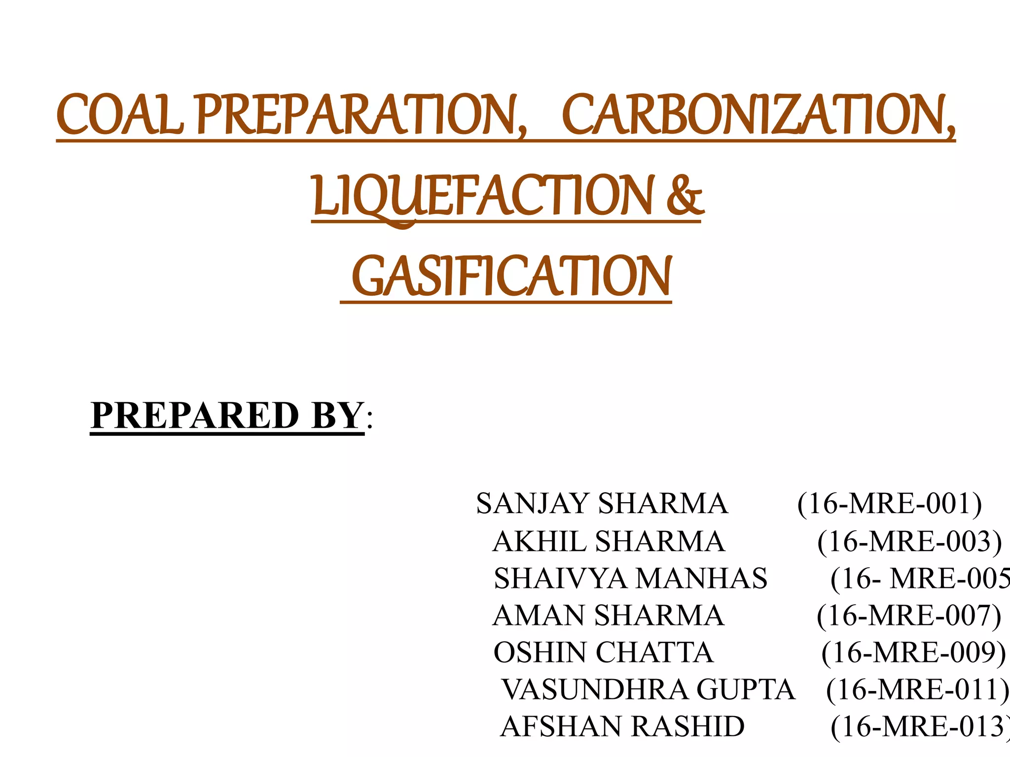 This document provides an overview of coal preparation, carbonization, liquefaction, and gasification processes. It describes how coal is cleaned and separated from impurities in preparation. Carbonization is the process of converting coal to coke through heating in the absence of air. Liquefaction and gasification convert coal to liquid and gaseous fuels. Key steps and technologies are outlined for each process, including separation mechanisms for preparation and different gasification techniques. Environmental and economic considerations are also briefly discussed.