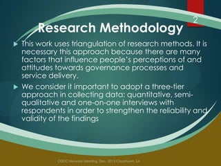 The document investigates the impact of Kenya's open data initiative on marginalized communities, using a mixed-methods approach to gather quantitative and qualitative data. It focuses on how the initiative assists these communities in accessing vital social services related to health and education, while also examining public perceptions and experiences regarding governance and service delivery. Key findings include that over half of the respondents believe the open data portal has improved service delivery and facilitated dialogue between the government and the public.