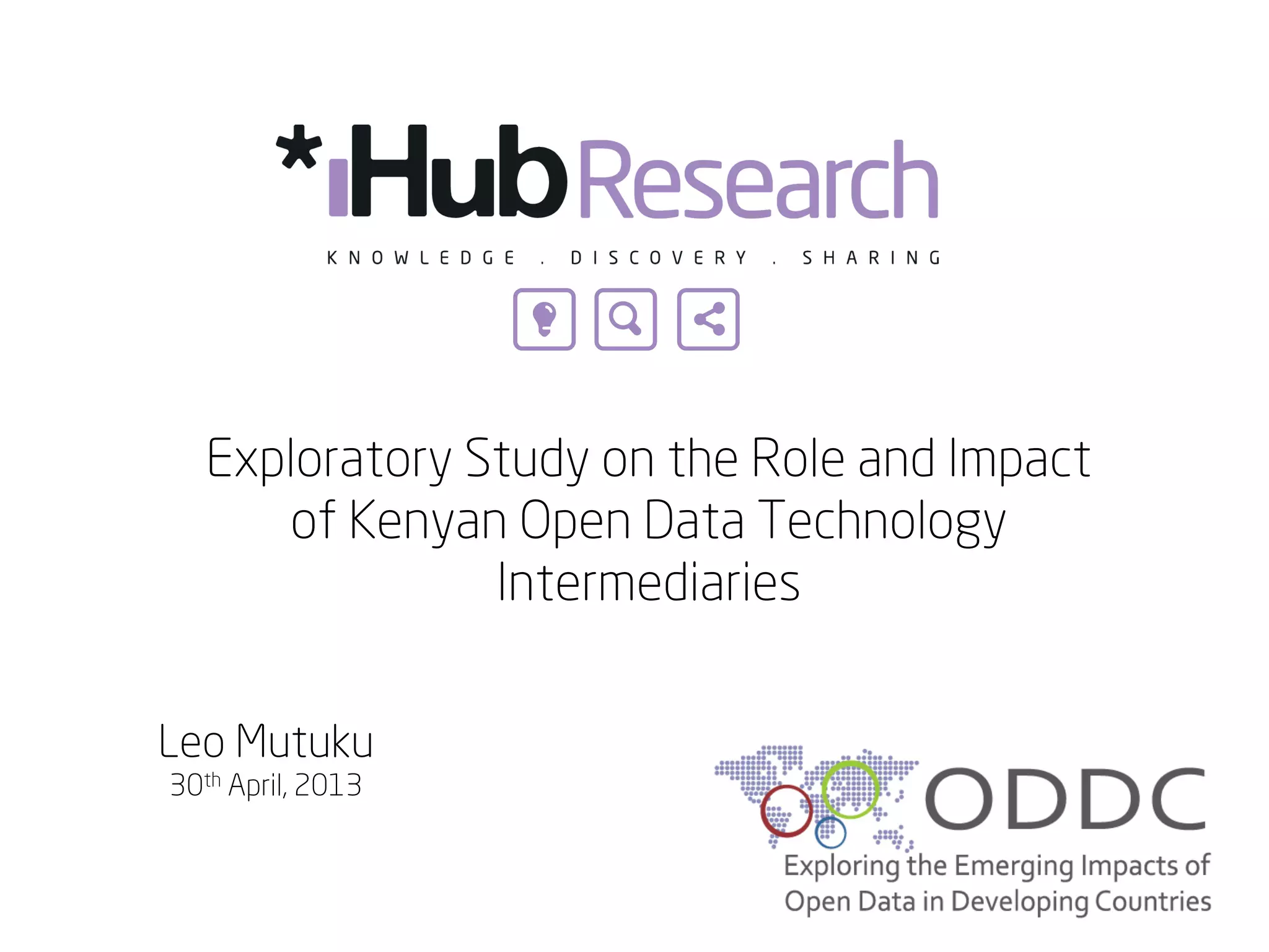 This document summarizes an exploratory study on the role and impact of open data technology intermediaries in Kenya. The study assessed how intermediary applications affect citizen awareness of open data availability, increase data consumption and use, and impact governance. A mixed methodology was used, including surveys, interviews, and user experience research. Emerging findings showed that while citizens access some government data, awareness of open data initiatives is low. Data quality issues also hindered use. Well-designed intermediary platforms can enhance access and usability of open data.