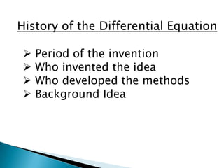 The document presents information about differential equations including: