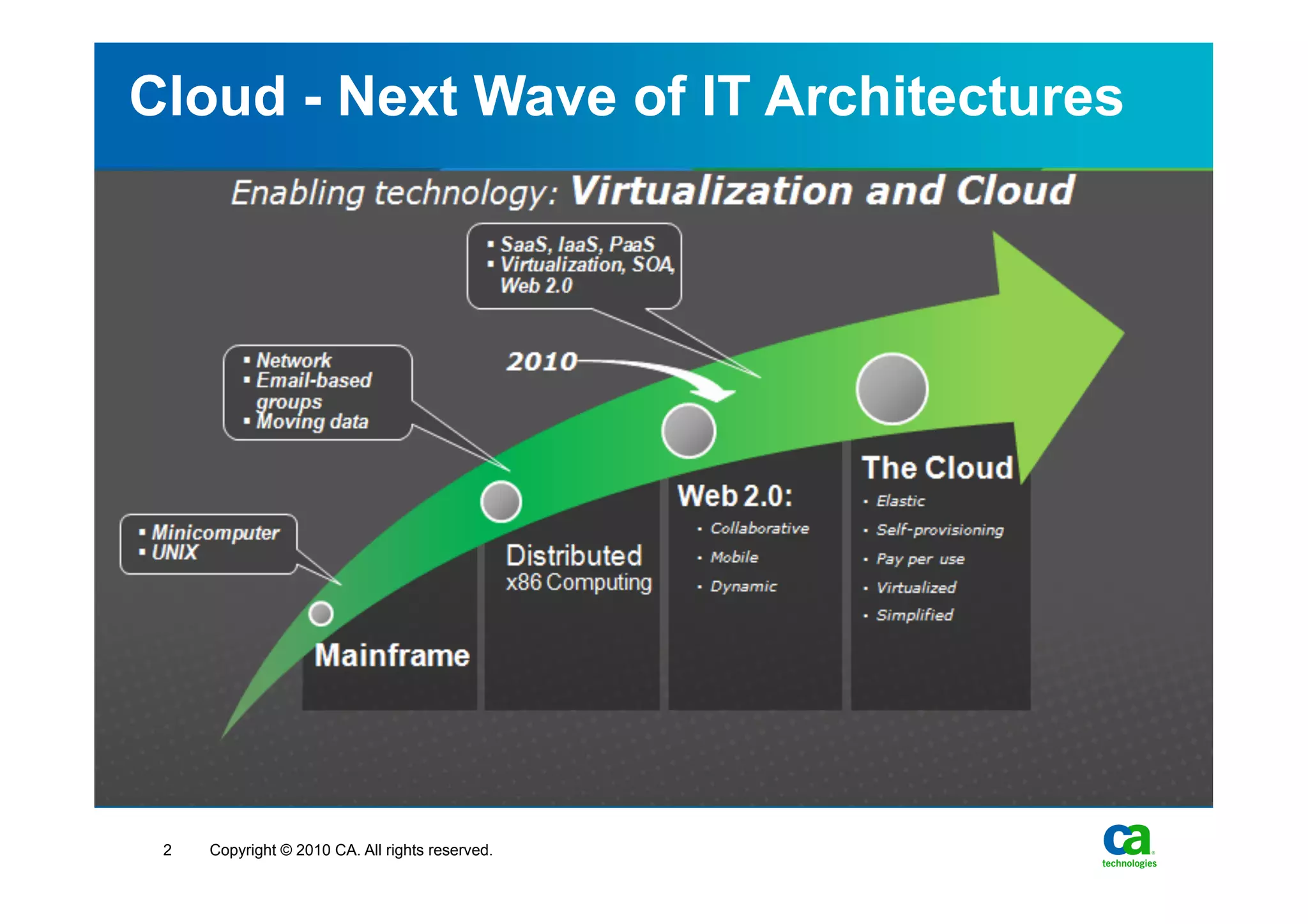 The document discusses security challenges related to cloud computing adoption and identity and access management (IAM). It notes that as organizations increasingly adopt cloud services, the traditional trust model between users and enterprises will need to change. Effective IAM will be crucial to extending enterprise security to the cloud, enabling cloud providers to gain customer trust, and potentially managing user identity from cloud identity services in the future. Key IAM capabilities like access governance, single sign-on, logging and more will need to scale across physical, virtual and cloud environments.