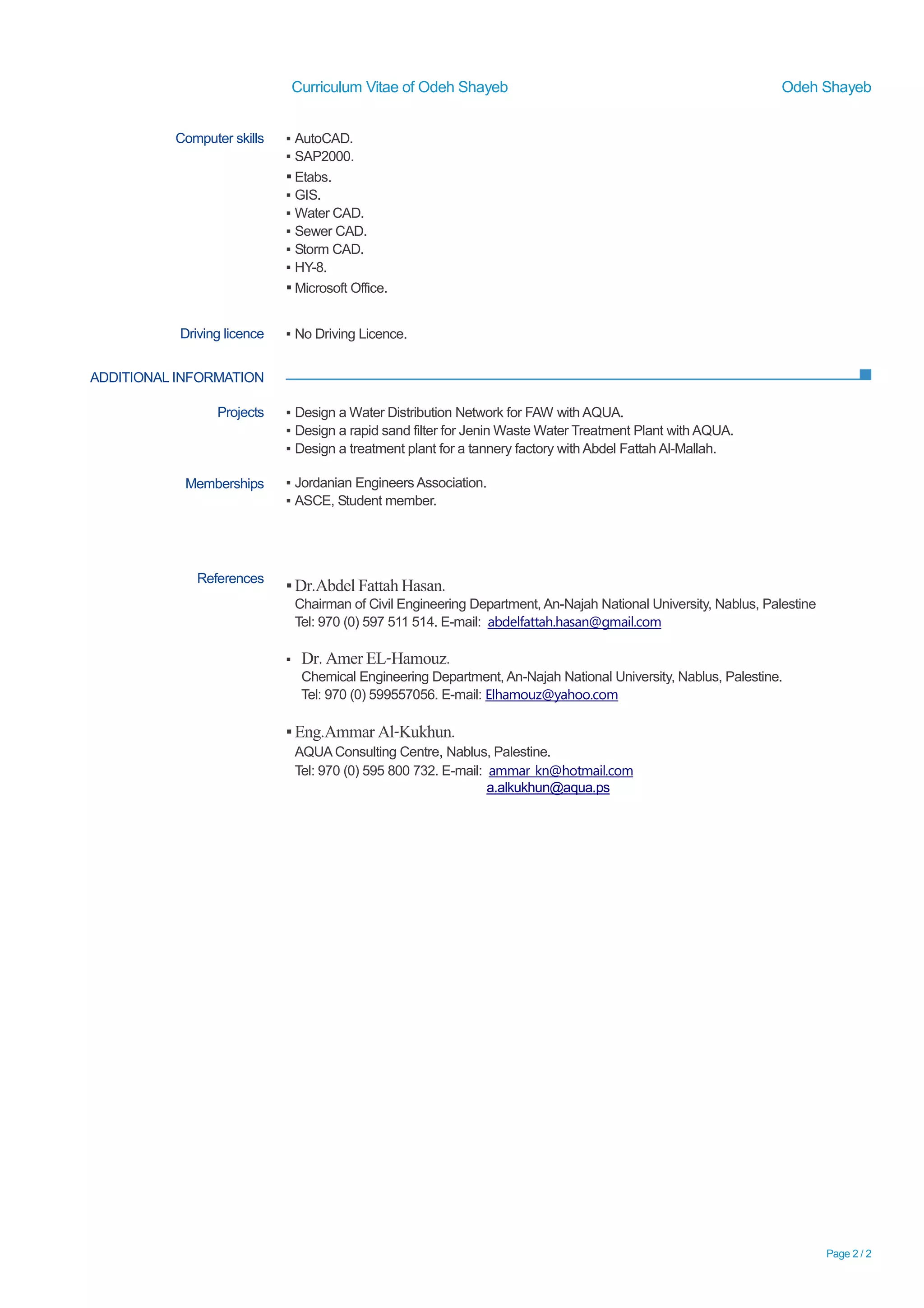 Odeh Shayeb is a Jordanian civil engineer from Palestine who has worked at AQUA Consulting Centre and ORA Engineering Office since 2014 on design projects related to hydraulics, structures, and water treatment. He received a BSc in Civil Engineering from An-Najah National University in 2014 and secondary education from Shuhada' Beit Leed Secondary School. His skills include AutoCAD, structural analysis software, GIS, project management, and communication. He is a member of the Jordanian Engineers Association and has experience designing water distribution networks and wastewater treatment plants.
