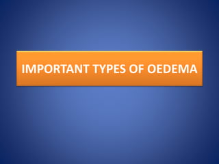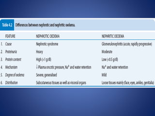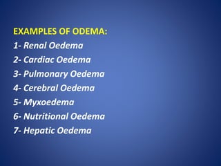 The document discusses different types of edema, including renal, cardiac, pulmonary, and cerebral edema. Renal edema can occur in nephrotic syndrome, nephritic syndrome, and acute tubular injury. Nephrotic edema is characterized by heavy proteinuria and hypoalbuminemia, while nephritic edema is caused by activation of the renin-angiotensin-aldosterone system. Cardiac edema develops due to heart failure, chronic hypoxia, or reduced cardiac output. Pulmonary edema can result from elevated pulmonary hydrostatic pressure, as in left heart failure, or increased capillary permeability due to infection, toxins, or altitude sickness.