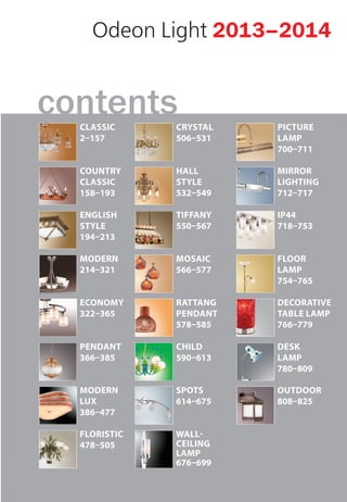 Документ содержит подробное описание различных моделей освещения от компании Odeon Light за период 2013–2014 годов. В нем представлены характеристики и спецификации ламп, включая типы, размеры, материалы и особенности дизайна. Документ организован по сериям и стилям освещения, что позволяет быстро находить необходимую информацию.