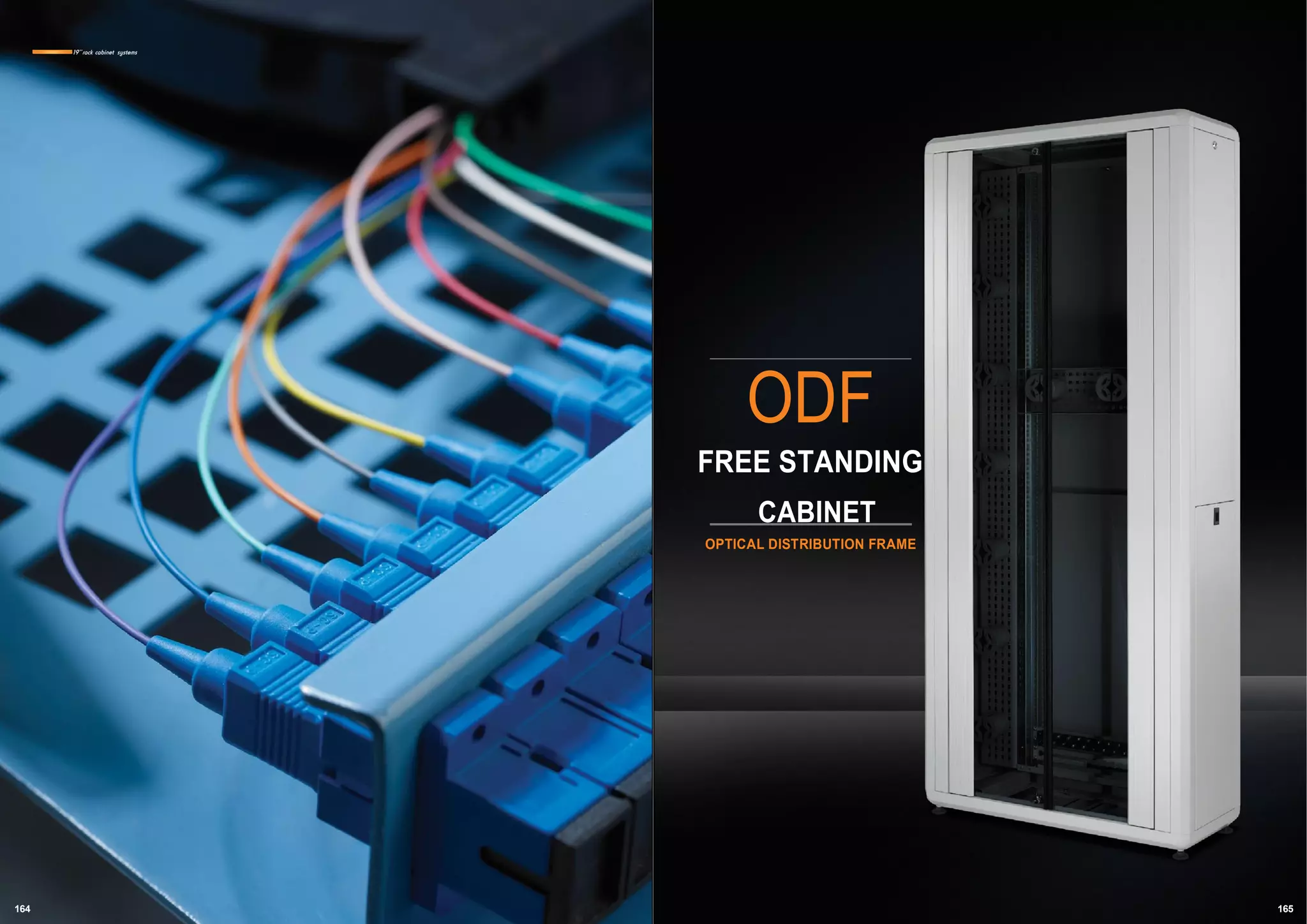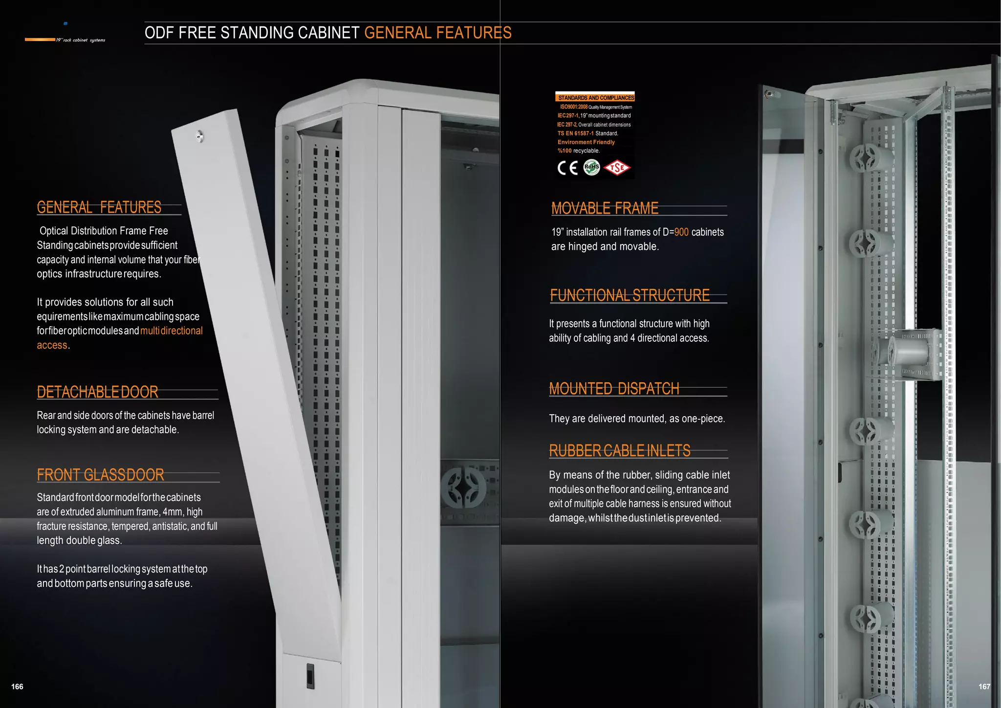 The document describes features and specifications for optical distribution frames (ODF) in free standing cabinets, compliant with various international standards. It outlines their environmental friendliness, internal capacity for fiber optics, and detailed construction information including dimensions, weight, and color options. Specific product codes and dimensions for various ODF cabinet models are also provided, with details regarding packaging and palletization.