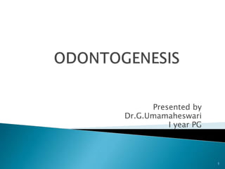 1. Tooth development involves interactions between the oral epithelium and underlying neural crest-derived ectomesenchyme. Molecules and signaling pathways initiate differentiation and morphogenesis of teeth.