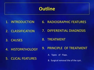 The document outlines various types of odontogenic cysts, their classifications, causes, histopathology, clinical features, and treatment options. It discusses specific types of cysts such as radicular, residual, dentigerous, lateral periodontal, and odontogenic keratocysts, providing insights into their origins and radiographic characteristics. Treatment approaches include enucleation and marsupialization, tailored based on the cyst's characteristics and impact on surrounding structures.