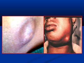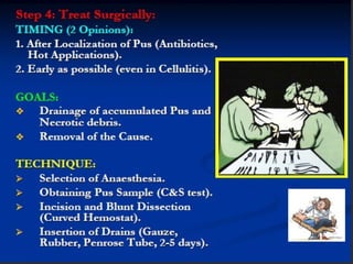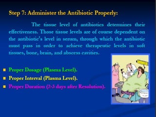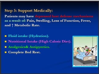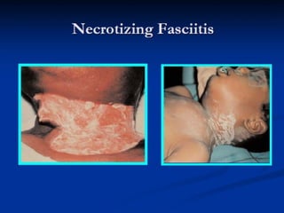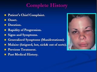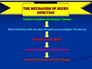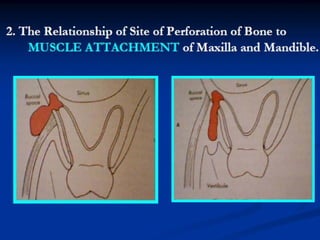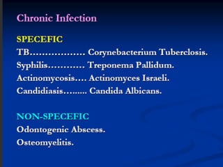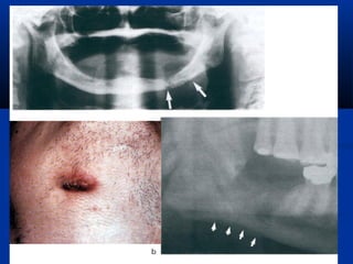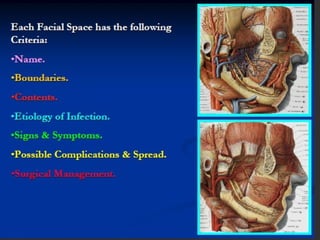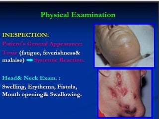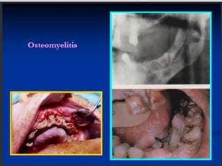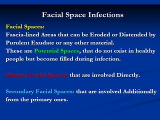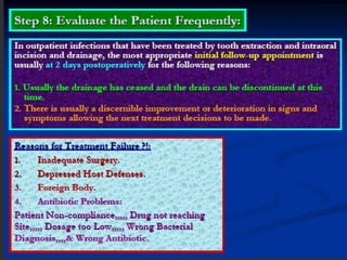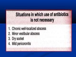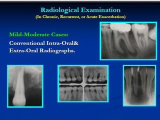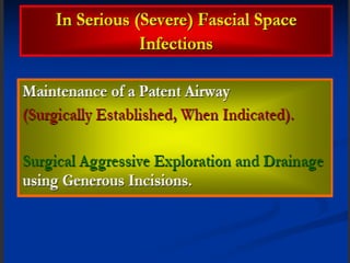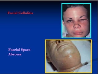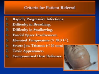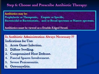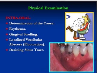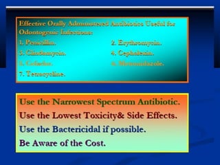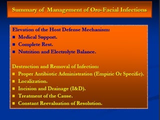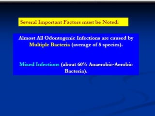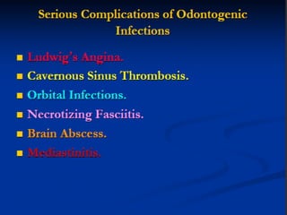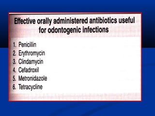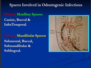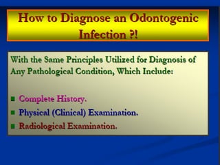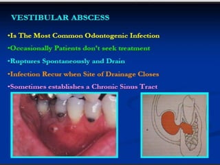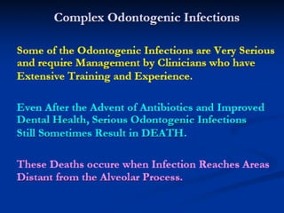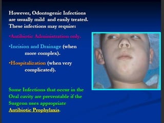 Odontogenic infections are caused by oral bacteria and can spread locally or systemically if not properly treated. Clinical signs may include pain, swelling, erythema, pus formation and fever. Management involves identifying the source, administering antibiotics, and potentially incision and drainage for more severe cases. It is important to promptly treat all odontogenic infections to prevent complications like spread to deep facial spaces.