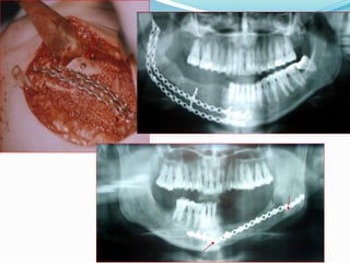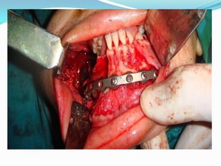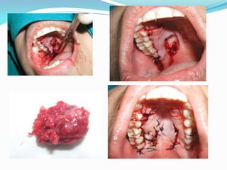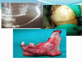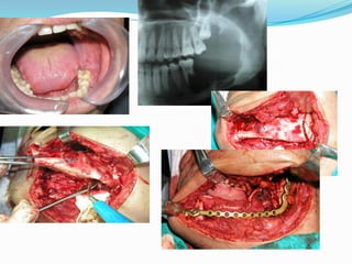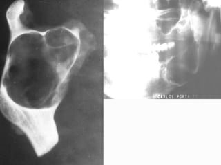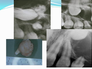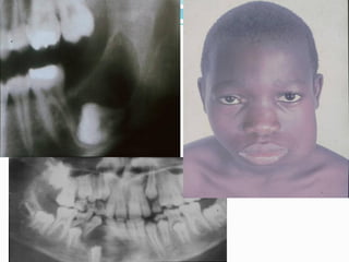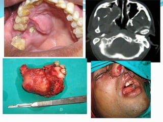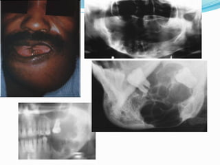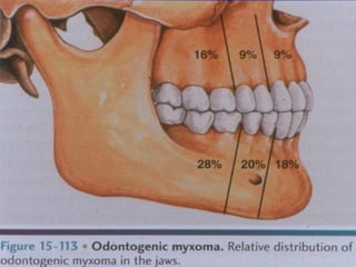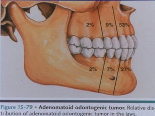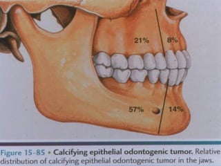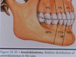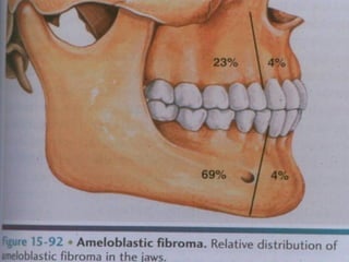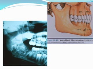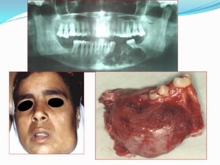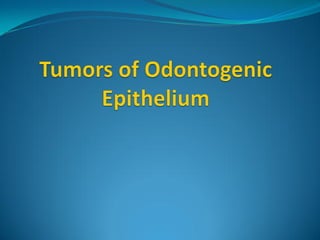 This document provides information on the classification, diagnosis, and treatment of odontogenic tumors. It begins by classifying odontogenic tumors into three categories based on their origin: tumors of odontogenic epithelium, mixed odontogenic tumors, and tumors of odontogenic ectomesenchyme. Ameloblastoma is then discussed in detail as the most common odontogenic tumor. The document outlines the clinical features, histologic features, diagnosis, and treatment considerations for solid/multicystic ameloblastoma. Complete surgical removal with adequate margins is indicated as the primary treatment approach to prevent recurrence of this locally invasive tumor.