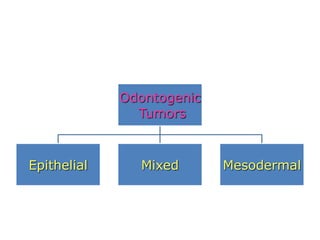 This document summarizes several odontogenic tumors including: ameloblastoma (benign, locally aggressive tumor of odontogenic epithelium that commonly occurs in the mandible), adenomatoid odontogenic tumor (uncommon, nonaggressive tumor that often surrounds an unerupted tooth), calcifying epithelial odontogenic tumor (rare benign neoplasm that usually occurs in the mandible), odontoma (tumor characterized by production of dental tissues that commonly occurs in young patients), ameloblastic fibroma (benign mixed odontogenic tumor that occurs in children/adolescents), odontogenic myxoma (benign tumor arising from dental papilla mesenchyme), cementoblast